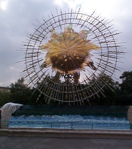 As you walk through the "Sunshine Plaza" the first thing you see is a 50 foot sun and the perpetual wave fountain. On sunny days there are these reflector thingies located opposite the sun that reflect the (real) sun's light towards the center of the sun sculpture. We did get to see that later in the day, and it's very striking. (Lee's note: The "reflector thingies" are called heliostats, they are programmed to not only track the sun but to move slightly every few seconds so that the solar highlights on the titanium covered sun sculpture move - turning it into a live sculpture. Also, you didn't really mention how "cool" the perpetual wave fountain is and that there is lots of nice seating here to just enjoy the show. This will be the place to meet people - like the circle in front of the castle in DL.)
