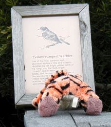 The orange-and-black-rumped Tigger examines the Yellow-rumped Warbler.