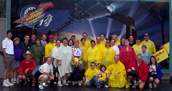 It was starting to rain not too long after I arrived at the Studios, and I still had some time, so I went into a couple of the shops - and it started to POUR. It rained pretty hard for about 20 minutes, then let up some, and I hoped that people would show up for the meet. I sought shelter just outside the last shop on Sunset Boulevard, and snagged a few people as they went by - including Lee, who had brought my jacket. :-) A little before 5:00 we went down to the front of the Tower, and discovered quite a yellow poncho-clad group. :-) Though by then (fortunately) the rain had mostly let up. We discovered that RADPers are pretty die-hard when it comes to the Tower of Terror! :-)