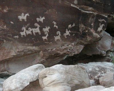 There were still a lot of people hiking up the trail as we were going down...and by the time we got down it was getting dark. I hope they had flashlights. Near the bottom of the trail are some Ute indian petroglyphs and we stopped to see those. (Doesn't this one look like a strange alien creature?)