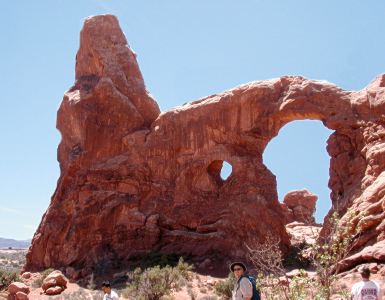 Our first hike was in what's called the "Windows" section. (After a stop at Balanced Rock - as you can see the rock isn't the only thing that's trying to balance. ;-) Oh, and balanced rocks are created because the sandstone in the top layer erodes more slowly than the sandstone in the "pedestal" layer.).