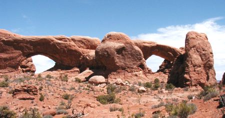We walked over to Turret Arch, and then North and South Window (we're not sure why they call them "windows" instead of "arches"). Then we took the "primitive trail" that went back around behind the windows - there had been a fair number of people around the front of the windows, but we had the backside to ourselves. Guess the whole "primitive" thing scared people off! It was a beautiful day with blue sky and some puffy clouds, but it was pretty windy - it was actually windy for almost all of our trip. I guess wind is normal in Utah at this time of year. I'd take the wind over summer heat any day, though!