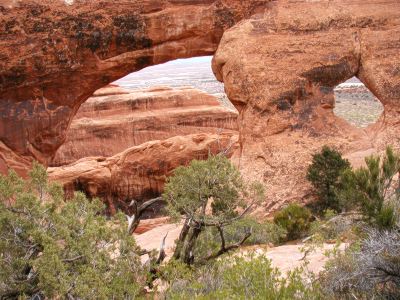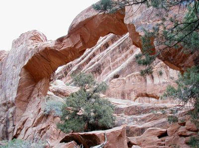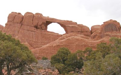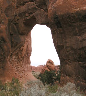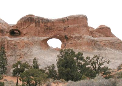 We didn't have time to do the entire Devil's Garden trail, but we did just over 3 miles of it in a little less than two hours. Landscape Arch (today's Arch of the Day!) is over 300 feet long, and only about 11 feet wide at its narrowest point. You can see fairly recent rockfall in the picture below the arch - a large piece fell in 1991 and some smaller pieces in 1995. Sure wish I'd had blue sky behind this rather than gray!