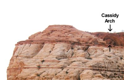 On the way back we went into the Grand Wash (which was full of warnings about NOT going there in stormy weather) to try to find me an "Arch of the Day". Walt finally spotted Cassidy Arch (yes, it's named after Butch Cassidy, who supposedly had a hideout near there) waaaay up on the canyon wall. There's a better view if you hike up to it, but we didn't have time. (There was a slight disagreement over today's "Arch of the Day" - earlier in the day we had seen this rock formation in Spring Canyon, which Walt was lobbying for as "Arch of the Day", but I wasn't convinced it met all of the "arch" criteria, and since it's my "Arch of the Day", *I* get to pick! :-) )