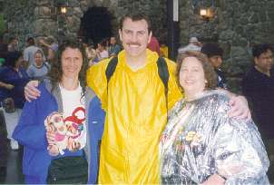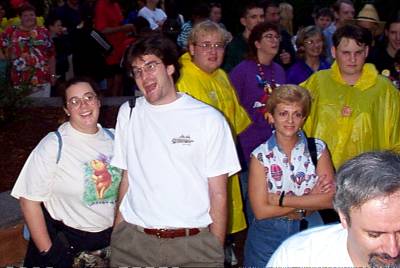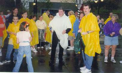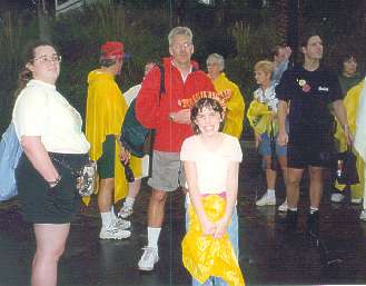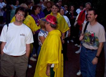 It was starting to rain not too long after I arrived at the Studios, and I still had some time, so I went into a couple of the shops - and it started to POUR. It rained pretty hard for about 20 minutes, then let up some, and I hoped that people would show up for the meet. I sought shelter just outside the last shop on Sunset Boulevard, and snagged a few people as they went by - including Lee, who had brought my jacket. :-) A little before 5:00 we went down to the front of the Tower, and discovered quite a yellow poncho-clad group. :-) Though by then (fortunately) the rain had mostly let up. We discovered that RADPers are pretty die-hard when it comes to the Tower of Terror! :-)