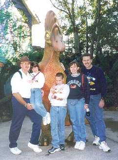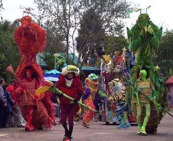 We all drove to Animal Kingdom, ("all" being Mom, Dad, Wayne, Lee and me, since Gary and Sia flew home the night before) and had a very cold tram ride in from the parking lot. Brr. We had decided to go to the next Pocahontas show, but had some time before then, and everyone wanted a snack of some kind...so we engaged in the search for the elusive chocolate covered pretzel. :-) (Actually it was only Mom who wanted one...and we found the place easily - but they hadn't made them yet that day). I got a caramel apple (the ones in Epcot at Canada are better - and cheaper!), and here's a tip for you: If you have long hair and you're eating a caramel apple on a windy day, always face upwind. :-) And no, I did NOT learn that lesson the hard way - not on *this* trip, at least. :-)
