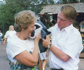 Outside the Pocahontas show, Mom got to meet Meeko up close and personal (Mom really likes raccoons). The Pocahontas show is cute, and the animals were all well-behaved - it's interesting to see them do their thing without much human interaction.