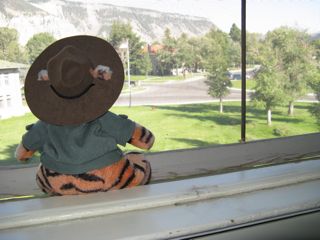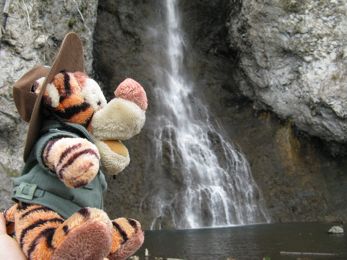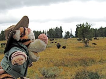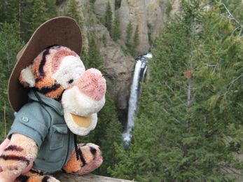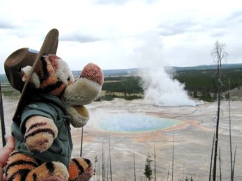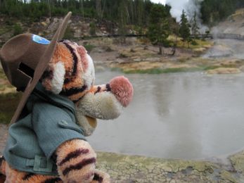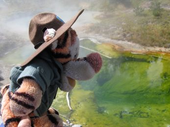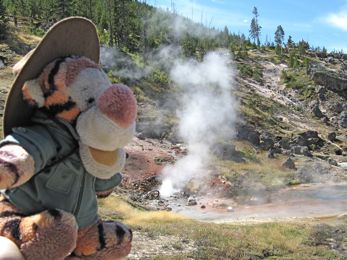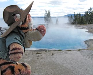 Tigger went all over Yellowstone National Park with Laura and Lee and Walt and Barb, and tried to stay out of hot water - kind of tough with all of those hot springs and geysers and mud pots around!